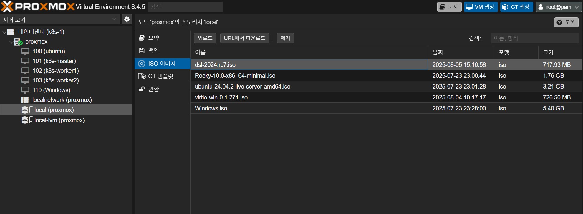 데이터센터 - proxmox - local 에서 ISO 이미지 탭으로 들어가 업로드 클릭