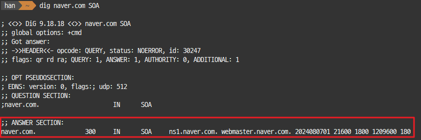 도메인 존 파일의 시작을 나타내며, 관리자 이메일 주소, 도메인 기본 네임 서버, 존 파일의 시리얼 번호 등을 포함합니다.