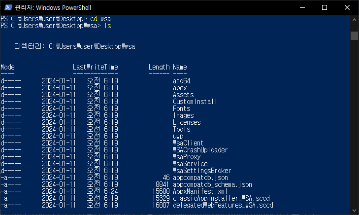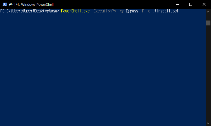 옮겨두었던 wsa 폴더로 이동하고 아래 명령어로 설치합시다.