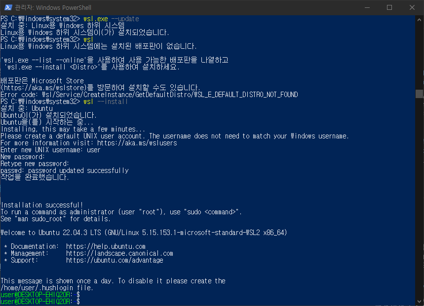 wsl --set-default-version 2 # WSL 기본 버전을 2버전으로 지정