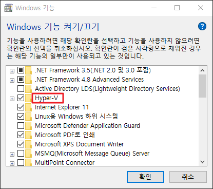 Hyper-V, 가상 머신 플랫폼을 체크한 후에 확인을 눌러주세요.